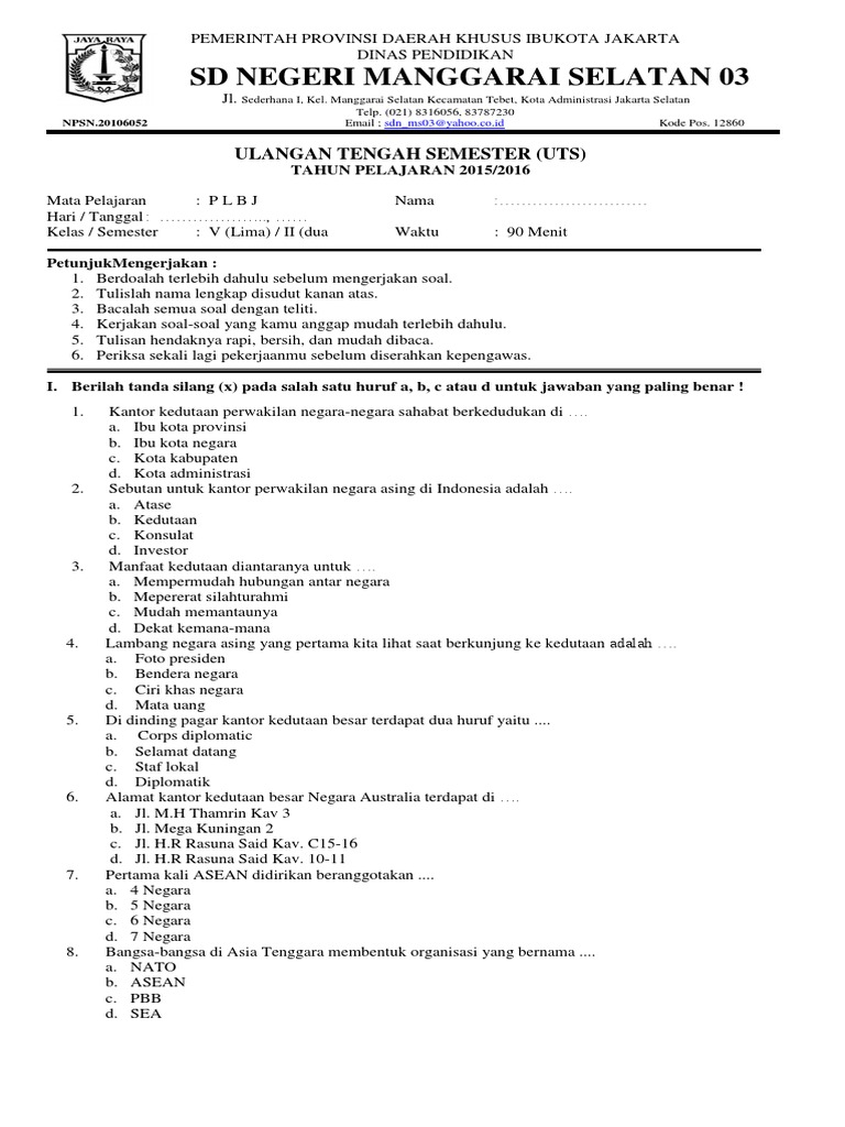 Soal uts pts kelas 5 semester 1 (bagian 1) dan kunci jawaban.